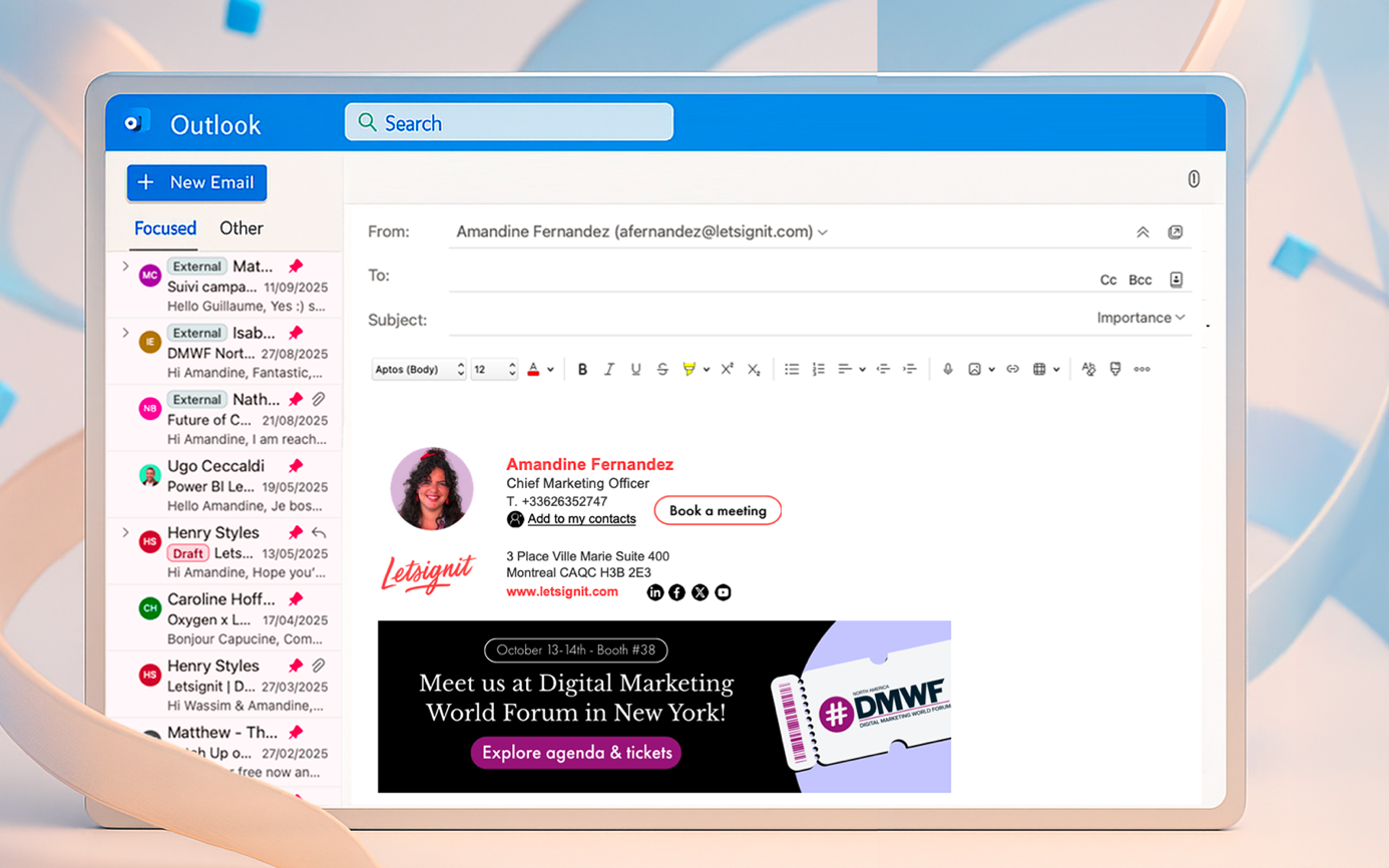 This is exactly what Letsignit delivers. Built with Microsoft technology, it syncs automatically with Azure Active Directory (Microsoft Entra ID), so job titles, addresses, and phone numbers are always up to date without employee action. Legal disclaimers are enforced globally across devices, while IT keeps security and governance intact. For employees, signatures integrate seamlessly no matter which device they use, and they can even select the version most appropriate for their contact, their language, or the campaign in play.